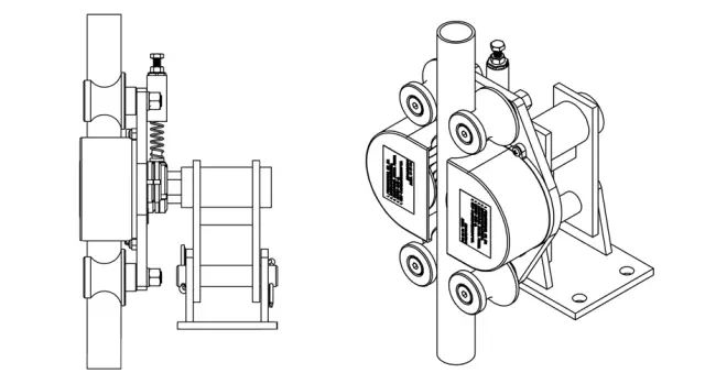 防墜器的底座固定于吊籠的頂部,導軌穿過(guò)前端的導向輪和偏心輪。吊籠正常升降的情況下,防墜器上下兩對導輪夾著(zhù)導軌平穩運行,中間的偏心輪處于張開(kāi)狀態(tài),當鋼絲繩斷裂吊籠瞬間墜落時(shí),防墜器的底座跟隨吊籠瞬間下落,瞬間下落的過(guò)程中,拉動(dòng)防墜器主軸,防墜器內部的齒條、小齒輪及偏心輪發(fā)生聯(lián)動(dòng)反應,偏心輪瞬間卡住導軌,吊籠在200mm內停止墜落。